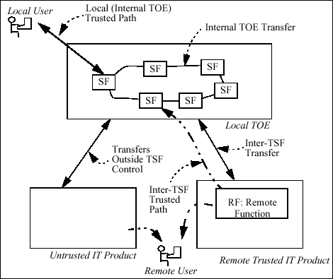 b) The remote IT product may not be evaluated, indicated in Figure 1.2 as 'untrusted IT product', therefore its security policy is unknown. Exchanges of information in this situation are called transfers outside TSF control, as there is no TSF (or its policy characteristics are unknown) on the remote IT product.