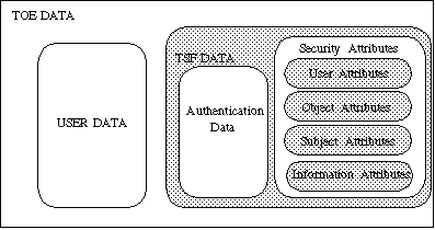 Data in a TOE is categorised as either user data or TSF data. Figure 1.3 depicts this relationship. User Data is information stored in TOE resources that can be operated upon by users in accordance with the TSP and upon which the TSF places no special meaning. For example, the contents of an electronic mail message is user data. TSF Data is information used by the TSF in making TSP decisions. TSF Data may be influenced by users if allowed by the TSP. Security attributes, authentication data and access control list entries are examples of TSF data.