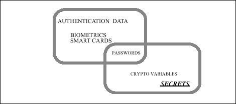 Therefore, some, but not all, authentication data needs to be kept secret and some, but not all, secrets are used as authentication data. Figure 1.4 shows this relationship between secrets and authentication data. In the Figure the types of data typically encountered in the authentication data and the secrets sections are indicated.