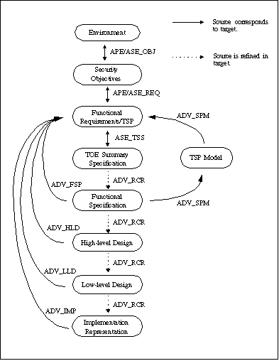 The requirements for all other correspondence shown in Figure 10.2 are defined in the ADV class. The ADV_SPM family defines the requirements for correspondence between the TSP and the TSP model, and between the TSP model and the functional specification. The ADV_RCR family defines the requirements for correspondence between all available TSF representations from the TOE summary specification through the implementation representation. Finally, each assurance family specific to a TSF representation (i.e. ADV_FSP, ADV_HLD, ADV_LLD and ADV_IMP) defines requirements relating that TSF representation to the functional requirements, the combination of which helps to ensure that the TOE security functional requirements have been addressed. The traceability analysis is always to be performed from the highest-level TSF representation down through each of the TSF representations that are provided. The CC captures this traceability requirement via dependencies on the ADV_RCR family. The ADV_INT family is not represented in this figure, as it is related to the internal structure of the TSF, and is only indirectly related to the process of refinement of the TSF representations.