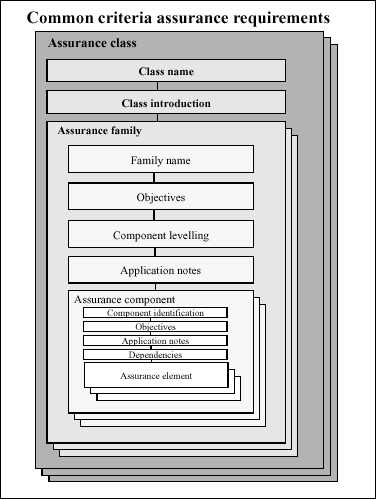 Figure 2.1 illustrates the assurance requirements defined in this CC Part 3. Note that the most abstract collection of assurance requirements is referred to as a class. Each class contains assurance families, which then contain assurance components, which in turn contain assurance elements. Classes and families are used to provide a taxonomy for classifying assurance requirements, while components are used to specify assurance requirements in a PP/ST.