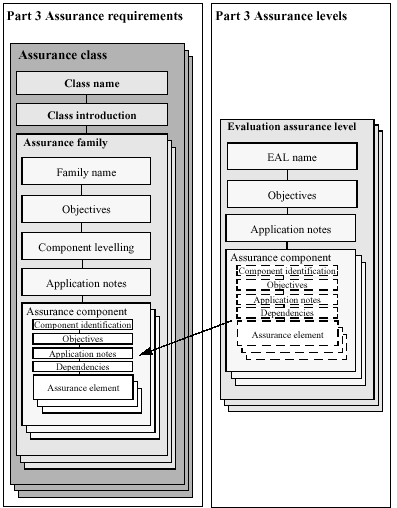 Figure 2.3 illustrates the EALs and associated structure defined in this Part 3. Note that while the figure shows the contents of the assurance components, it is intended that this information would be included in an EAL by reference to the actual components defined in the CC.
