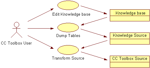 Figure 5-1 indicates how to edit the knowledge base and make it accessible to the CC ToolBox. The action labeled Edit knowledge base represents interactions with the knowledge base that are required to create a new CC Profiling knowledge base for use with the CC ToolBox. Information needed to perform the Edit knowledge base action is given above in Sections 4 and 5.1. The resulting new knowledge base is depicted as the box labeled Knowledge base.